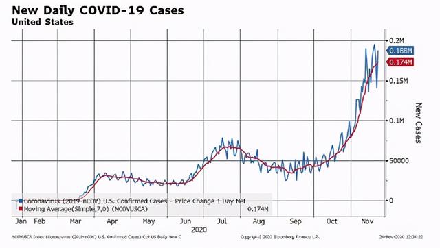 加拿大在2020年10月11日庆祝完感恩节之后,日新增感染病例增加了3.5倍。如果参考这样的速度,圣诞节之前美国的新增病例可能达到60万/日。