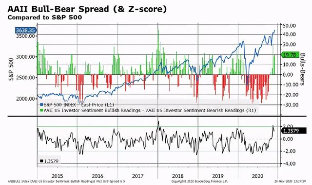 ⑥美国个人投资者协会(AAII)的牛熊利差最近达到了+30,这种两个标准差的现象为2018年1月以来首现。