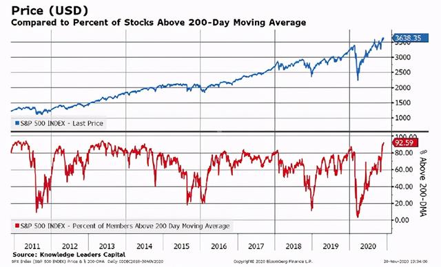 ⑤疯狂乐观还不仅限于期权市场,92.5%的标普500股票今交投在200日均线之上,超买水平为2014年来最高。
