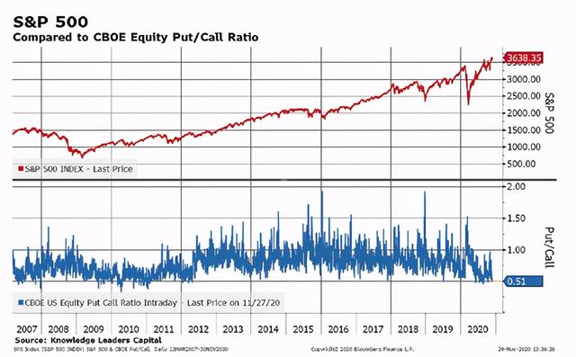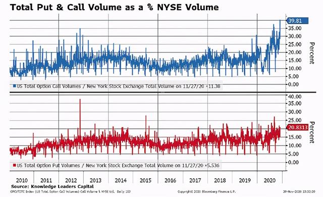 ③再从期权市场看,截止上周,看涨规模是正常水平的四倍,占了纽交所总交易量的大约40%,史上最高。