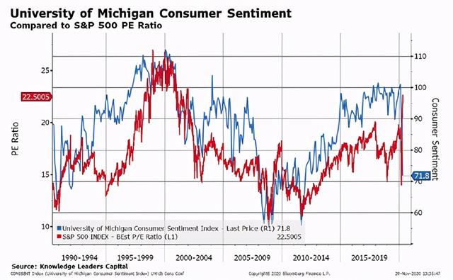 ①美国的经济数据开始走弱,消费者信心指数已经明显下跌,与标普500指数的走势不对称。