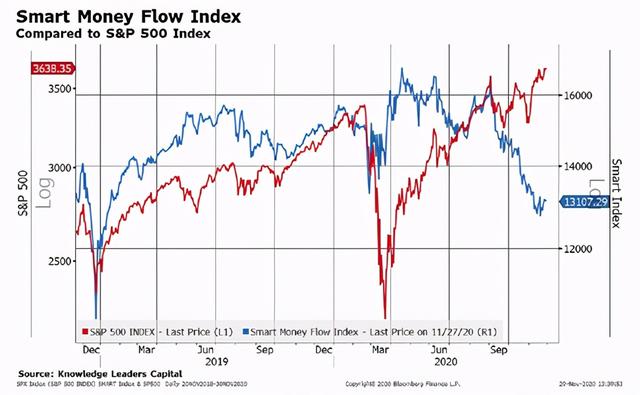 ②聪明钱流动指数走低的同时美股上涨,表明市场大玩家们在撤退,而资金更多来自散户投资者。