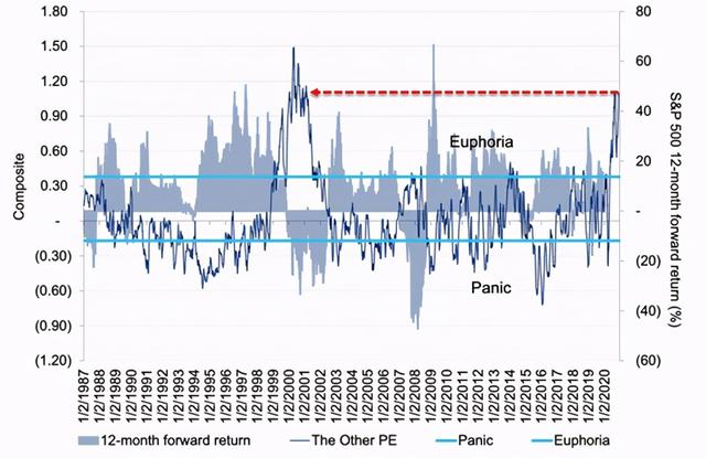 ⑦投资者疯狂涌入股市已经将标普500的远期市盈率(forward P/E)推高到2000年的水平。