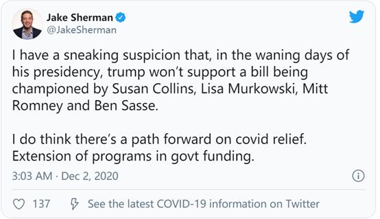 (因为美国两党当前还需要在12月11日之前批准财政预算,否则联邦政府将会在12月12日后关门,一系列政府计划将会中断,许多联邦员工将被迫放无薪假。目前并不排除在两党认可的前提下,疫情救济法案被直接放入财政预算中一同表决。)