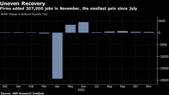 根据周三发布的ADP数据,11月份企业就业人数增加了307,000,此前一个月数据被向上修正至404,000, 彭博经济学家调查得出的预测中值为增加440,000。