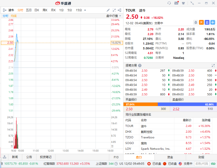 途牛(TOUR.O)反弹一度涨逾24%,昨日收跌24.11%。