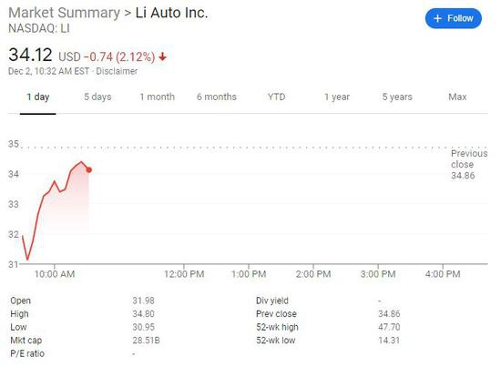若跌幅在周三延续至收盘,理想汽车将连跌五个交易日,此前在截止周二的四日连跌中已累跌20.7%。不过,自7月30日赴美上市以来,理想股价每个月线均上扬,10月和11月的两个月中累涨近107%,11月24日曾创历史最高43.96美元,是9月末收盘价17.39美元的逾2.5倍。