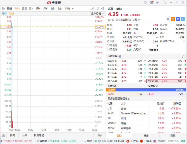 12月3日晚间消息,荔枝开盘涨超80%,截止发稿,涨幅扩大到接近100%,报4.69美元,盘前一度涨近120%。此前荔枝宣布与小鹏汽车达成车载音频方向合作。