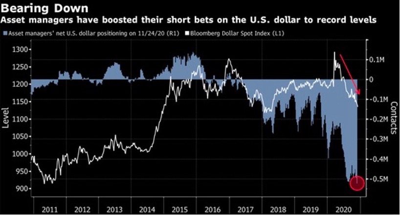 彭博美元即期指数显示美元螺旋下跌,跌到了2018年4月以来低点。市场预期2021年经济增长前景向好,同时美国之外可能有更好的投资机会,美元下跌正是金融市场在这种预期下更广泛走势的一部分。本周美元跌势之广让美元空头备受鼓舞:欧元、澳元、加元和韩元本周均触及两年多来的最高水平,瑞郎则创下了2015年以来的最高水平。华尔街一些人士警告称,鉴于美联储将多年保持低利率,美元将经历看跌周期。这一切都在印证着这个预测。