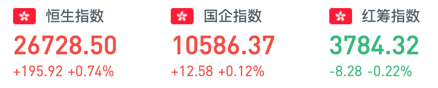 周四,恒生指数开盘涨0.34%,全天震荡上扬。截至收盘,恒生指数涨195.92点或0.74%,报26728.5点,全日成交额达1354.5亿。国企指数涨0.12%,报10586.37点,红筹指数跌0.22%,报3784.32点。