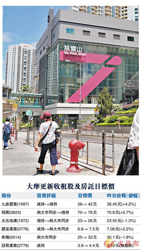 基于中环与其他地方的租金差距收窄,大摩料写字楼去中环化将会暂缓。故此,大摩调高本港的收租股目标(见表),当中九置可得益于奢侈品销售增长及旅客回归,现价的股息率有4厘也属合理。其次看好领展,因其是少数仍能增加派息的本港地产股,料受惠中产消费转移至低端市场的趋势。