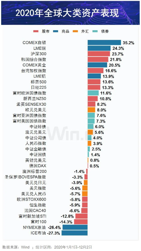 数据显示,2020年最大的投资机会来自于商品及风险资产价格大幅反弹,其中白银期货年化收益率超过30%,领涨各大类资产。