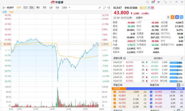 12月4日消息,华虹半导体尾盘反弹涨2.46%,报43.8港元,此前一度跳水跌超15%。