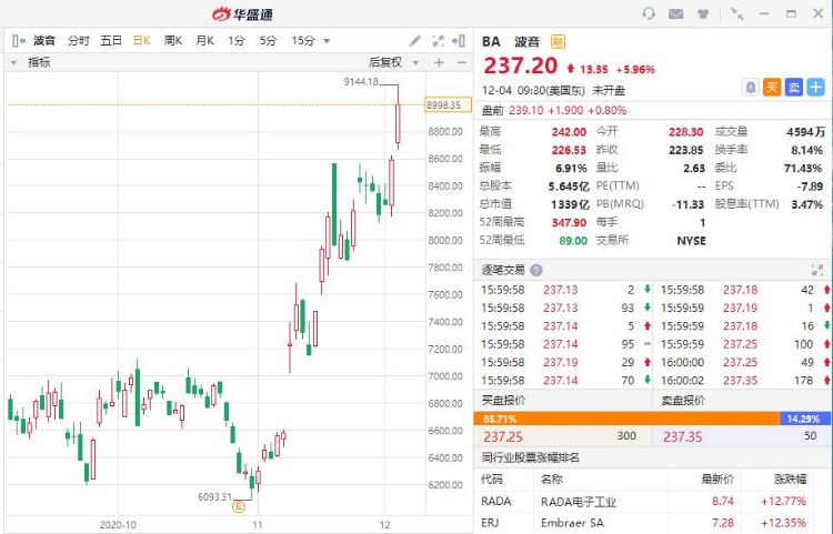 其中,截至收盘,波音涨5.96%领涨板块,收于237.20美元,最新总市值为1338.87亿美元,而今年以来,其股价累计跌幅已超过41%。