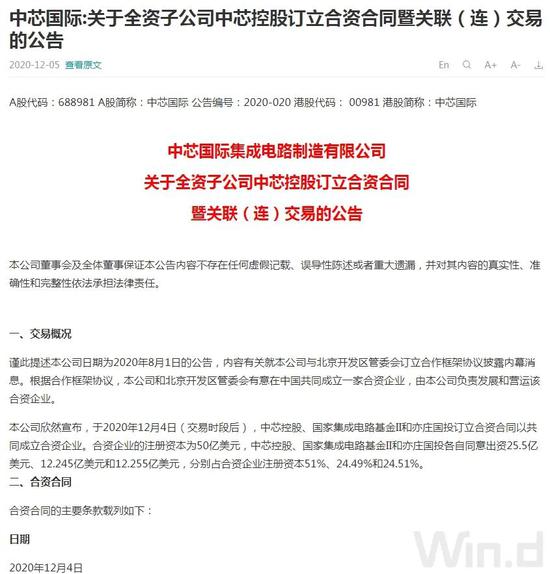 12月4日晚间,中芯国际公告称,中芯控股、国家集成电路基金II和亦庄国投订立合资合同以共同成立合资企业。合资企业的注册资本为50亿美元,中芯控股、国家集成电路基金II和亦庄国投各自同意出资25.5亿美元、12.245亿美元和12.255亿美元,分别占合资企业注册资本51%、24.49%和24.51%。合资企业的业务范围包括生产12吋集成电路晶圆及集成电路封装系列;技术测试等。