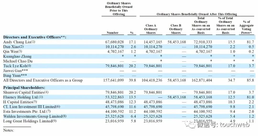 IPO后,Andy Chang Liu持股15.5%,有81.7%的投票权;顺为资本持股为17%,有3.7%的投票权;H Capital持股为10.3%,有2.2%的投票权,CL Lion Investment III Limited持股为9.8%,有2.1%的投票权;