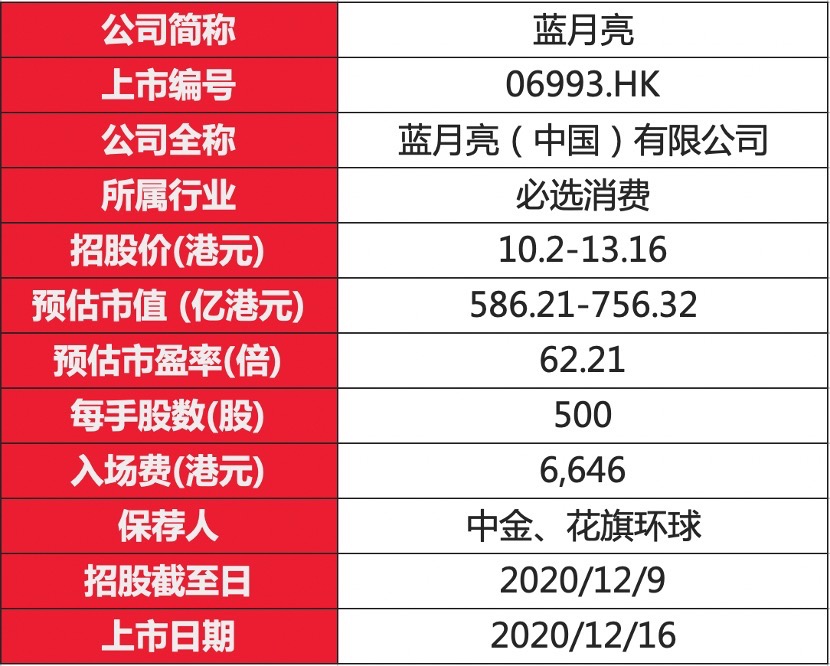 蓝月亮每股发售价10.20港元-13.16港元,每手500股,入场费约6646港元。预期公司将于2020年12月16日上市买卖,BofA SECURITIES、中金公司及花旗为联席保荐人。