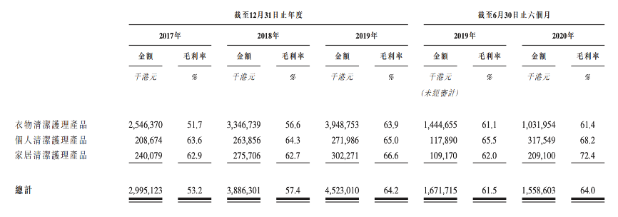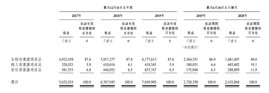根据招股书,蓝月亮旗下产品分为三大类:1)衣物清洁护理产品;2)个人清洁护理产品;3)家居清洁护理产品。