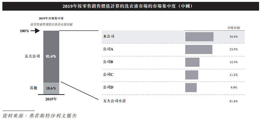 竞争格局方面,根据弗若斯特提高的调研报告,蓝月亮在中国洗衣液市场的市场份额已经连续11年(2009年至2019年)位居第一。2019年,蓝月亮的洗衣液的零售销售价值为人民币66亿元,占中国洗衣液分部整体市场份额的24.4%。