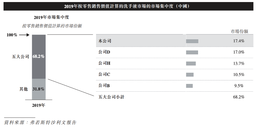在洗手液市场,蓝月亮也是国内巨头。根据弗若斯特沙利文报告,2019年,蓝月亮在中国洗手液市场的市场份额连续八年(2012年至2019年)位居第一。公司的洗手液零售销售价值为人民币474.3百万元,占整个洗手液市场的17.4%,具备市场领先地位。