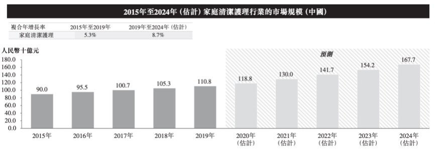 根据咨询机构提供的报告,中国家庭清洁护理行业的零售销售总价值有望继续增长,2019年至2024年有望保持8.7%的复合年增长率。此外,中国家庭清洁护理行业的增速将高于全球及其他经济体家庭清洁护理行业增速,从而使中国能够扩大其在全球家庭清洁护理行业中的市场份额。