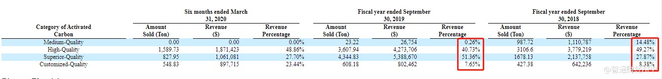 据招股书显示,2019财年时,中北能的活性炭产品主要为高质量和超高质量两种,二者的比例分别为40.73%、51.36%,合计超90%,剩余7.65%为定制质量,中等质量产品占比仅0.26%。反观2018财年,中等质量产品的收入占比为14.48%,而高质量与超高质量两大产品的占比分别为49.27%、27.87%,合计77.14%,较2019财年时低近13个百分点。此外,定制质量产品占比为8.38%。