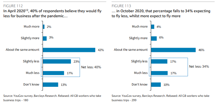 巴克莱认为,远程工作和虚拟会议的效率将对与商务相关的旅行产生永久性的影响。