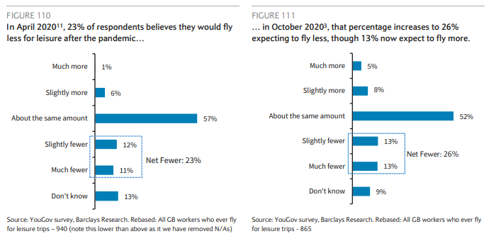 巴克莱在4月和10月所作的两份调查显示,在经历了6个月之后,越来越多的受访者认为,将来会更少地因为休闲娱乐而出行。