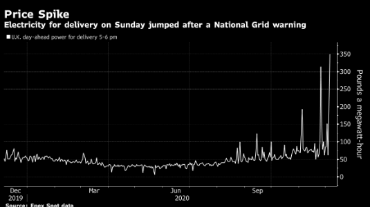 英国电力价格升至四年高位,此前英国电网运营商警告说,周日晚间电力供应的安全缓冲几乎受到侵蚀。