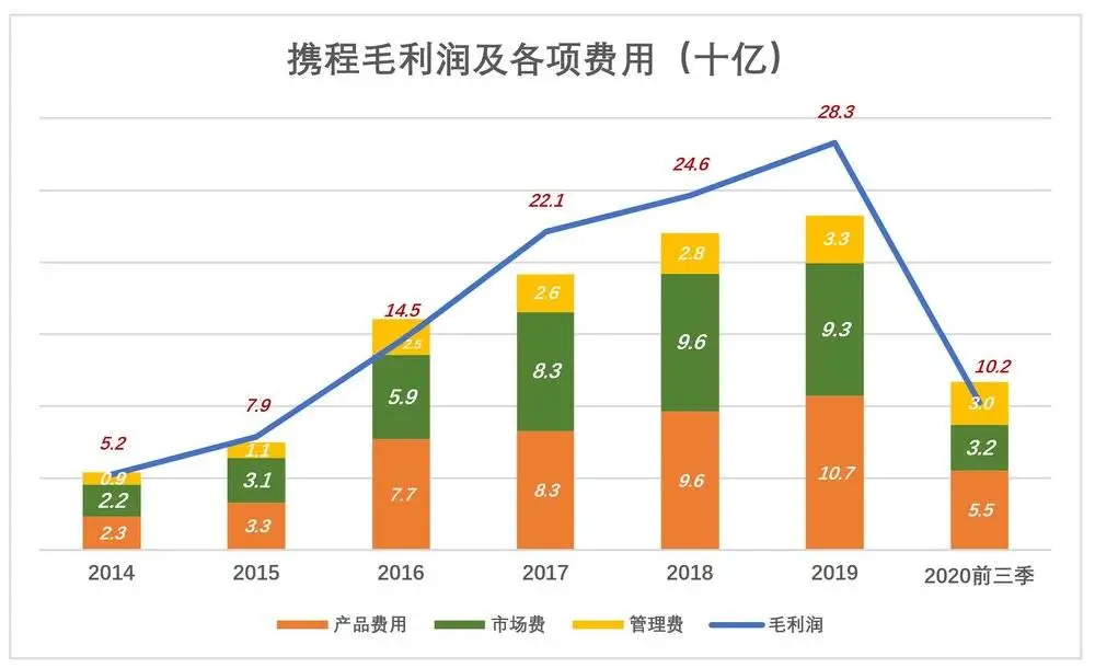 2014、2015、2016在线旅行市场竞争异常激烈,出现全行业亏损。最终,连“流淌着盈利基因”的携程也没能幸免。先后收购艺龙、去哪儿网后,携程重现大蓝筹风采。2019年毛利润282.9亿、三项费用合计232.5亿经营利润达50.4亿。