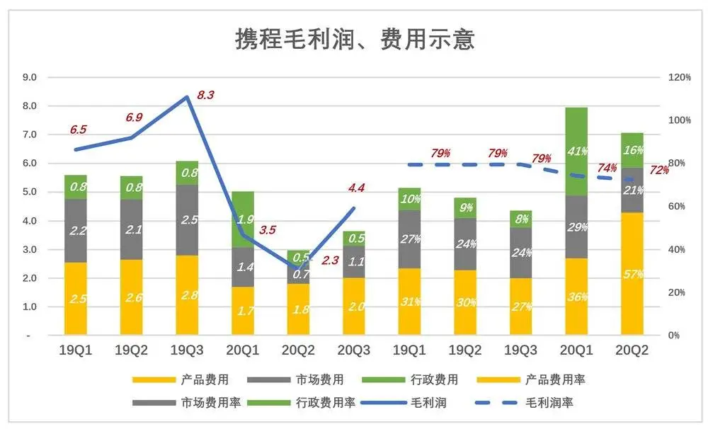 2020年前两季,携程面临的压力越来越大。一季度毛利润剧降至35亿、三项费用被压缩到50亿;二季度毛利润则进一步跌至23亿、费用被压缩至30亿。三季度毛利润回升到44亿,环比上升93.8%,费用合计36.4亿,环比仅上升22.4%。