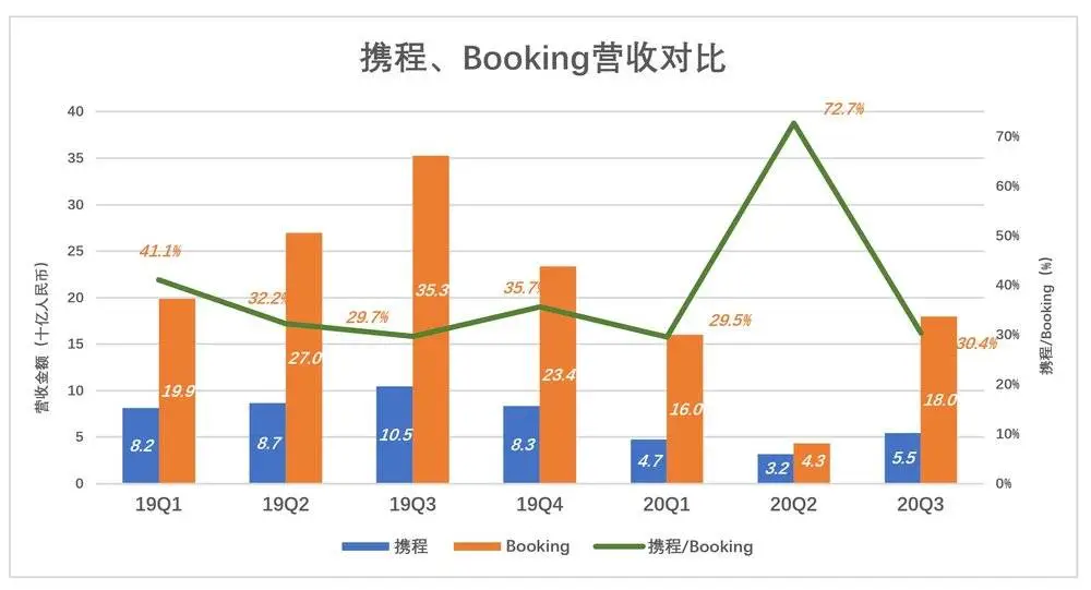 2020年11月5日、12月2日,Booking、携程先后发布了2020年Q3业绩。Booking季度营收26.4亿美元,同比下降47.6%;携程营收54.6亿人民币,同比下降47.9%。一季度携程营收相当于Booking的29.5%,比2019年同期下降11.6个百分点;二季度携程营收飙升到Booking的72.7%,三季度又降至Booking的30.4%。