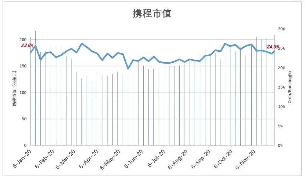 2020年12月3日,携程收盘价35.22美元,市值209亿美元;同日Booking收于2096.6美元,市值859亿美元;携程市值相当于Booking的24.3%。