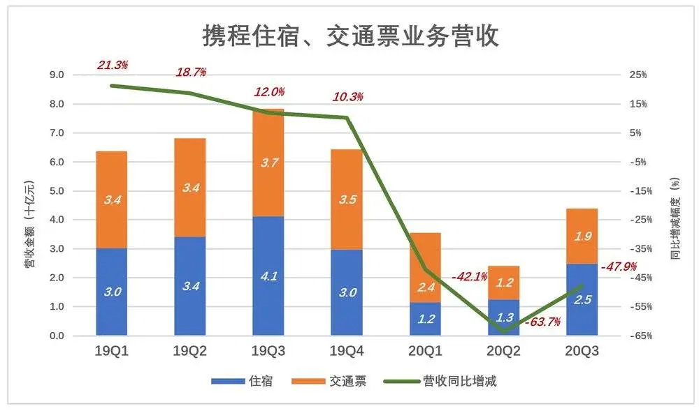 受疫情影响,2020年一季度住宿、交通票业务营收同比分别下降61.7%和28.7%,集团整体收入下降42.1%。二季度,住宿、交通票业务收入分别下降63.2%和66.2%,集团整体收入下降63.7%;三季度,住宿、交通票业务收入分别下降39.8%和48.8%,集团整体收入下降47.9%。#至暗时刻已过#