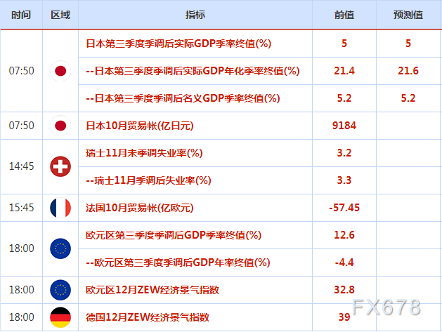 周二经济数据也比较少,一方面留意日本和欧元区第三季度的GDP终值的表现,另一方面,留意日本和法国的贸易帐,预计对行情的影响都比较有限。