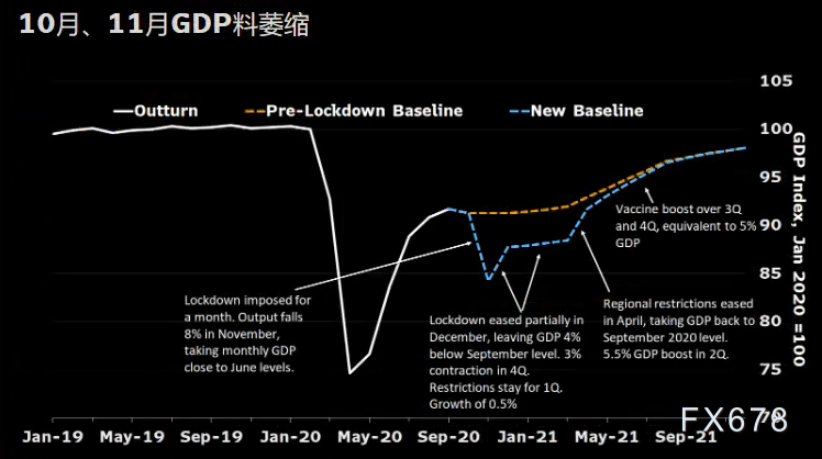 由于英格兰实施局部封锁,11月GDP可能会大大下降,预计萎缩幅度为8%,尽管也有以更小幅度萎缩的可能性。 12月限制措施放松,GDP可能会急剧上升。尽管如此,预计直到2021年4月才能回升到9月水平。