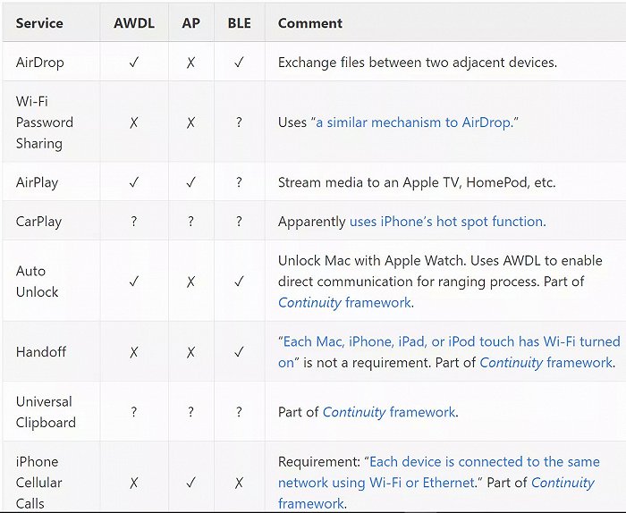 虽然大多数苹果终端用户可能没有意识到该协议的存在,但是 AWDL 是苹果公司 AirPlay 和 Air Drop 等服务的核心,而且苹果公司已经默认在其销售的所有设备上包含了 AWDL,如 Mac、 IPhone、 Ipad、苹果手表、苹果电视和 HomePods。