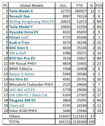 12月6日,根据电动车市场机构EV Sales Blog发布的相关数据显示,十月份全球电动汽车销量中,特斯拉(TSLA.US) Model 3以26.1万辆的月销数据高居榜首,雷诺佐伊 (Zoe)以7.41万辆的数据位列次席。特斯拉Model Y、奥迪e-Tron以及比亚迪(01211)秦系列分居该榜第4、第7以及第10位。