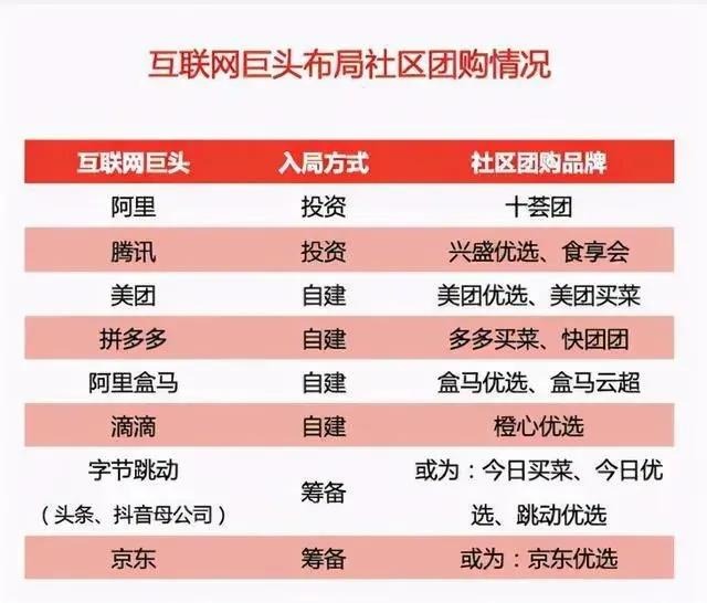 据报道称,字节跳动内部考虑自己孵化社区团购,在讨论方案中,项目被命名为“今日买菜”。在此之前,字节跳动在做电商方面入局已久:试水今日特卖、上线“放心购”业务、“放心购”升级为“值点商城”等。今年字节跳动正式成立了以“电商”明确命名的一级业务部门,以统筹公司旗下抖音、今日头条、西瓜视频等多个内容平台的电商业务运营。在电商领域涉足更多比如直播电商、跨境电商等。