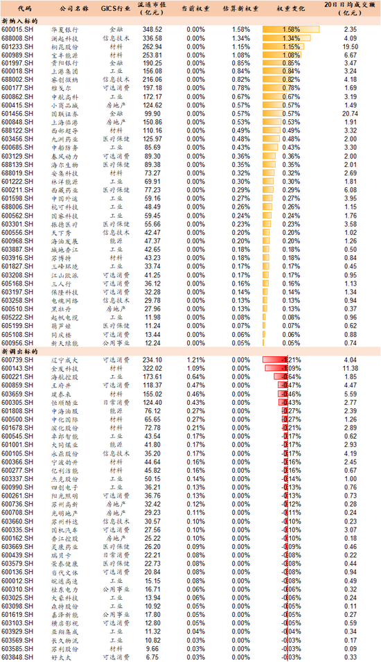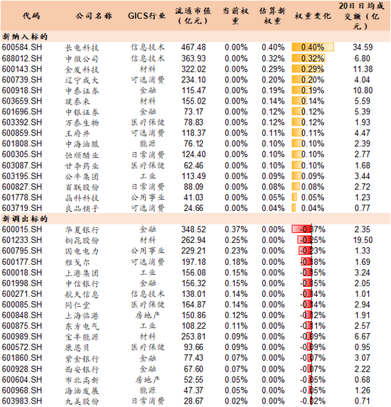 图表:上证380指数新纳入/调出标的及资金影响估算