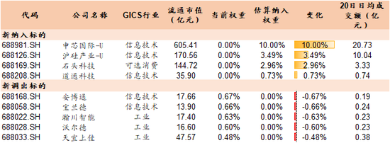 图表:科创50指数新纳入/调出标的及资金影响估算