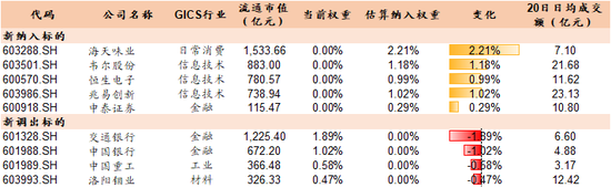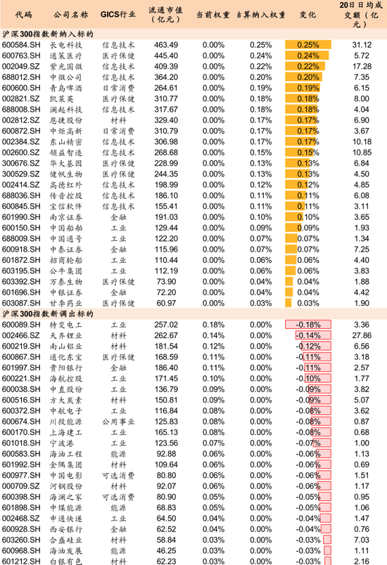 图表:沪深300指数新纳入/调出标的及资金影响估算