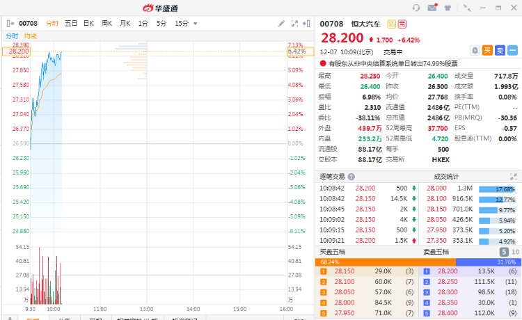 12月7日消息,恒大汽车涨6.42%,现报28.2港元,最新市值2486亿港元。
