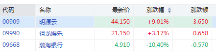 深交所公告,因恒生综合中型股指数实施成份股调整,根据《深圳证券交易所深港通业务实施办法》的有关规定,港股通股票名单发生调整并自今日起生效,调入明源云、渤海银行、祖龙娱乐。明源云现涨9.01%,祖龙娱乐涨3%,渤海银行跌10%。