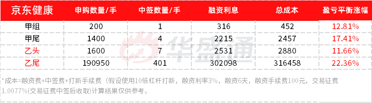 假设采用10倍杠杆,冻资期6天,利率3%,交易征费1.0077%,京东健康的融资打新盈亏平衡点如下: