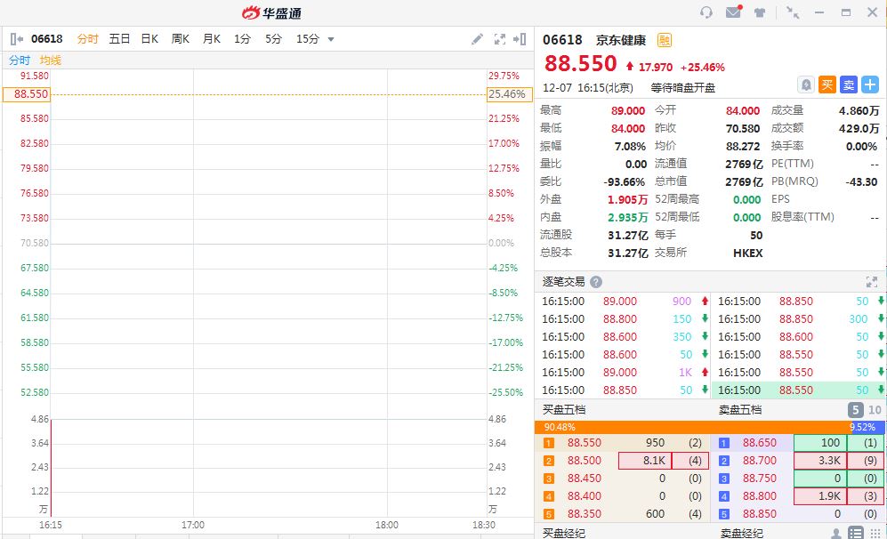 京东健康今日16:15-18:30期间进行暗盘交易,目前大涨25%。不计手续费,一手盈利896港元。该股明日正式上市。
