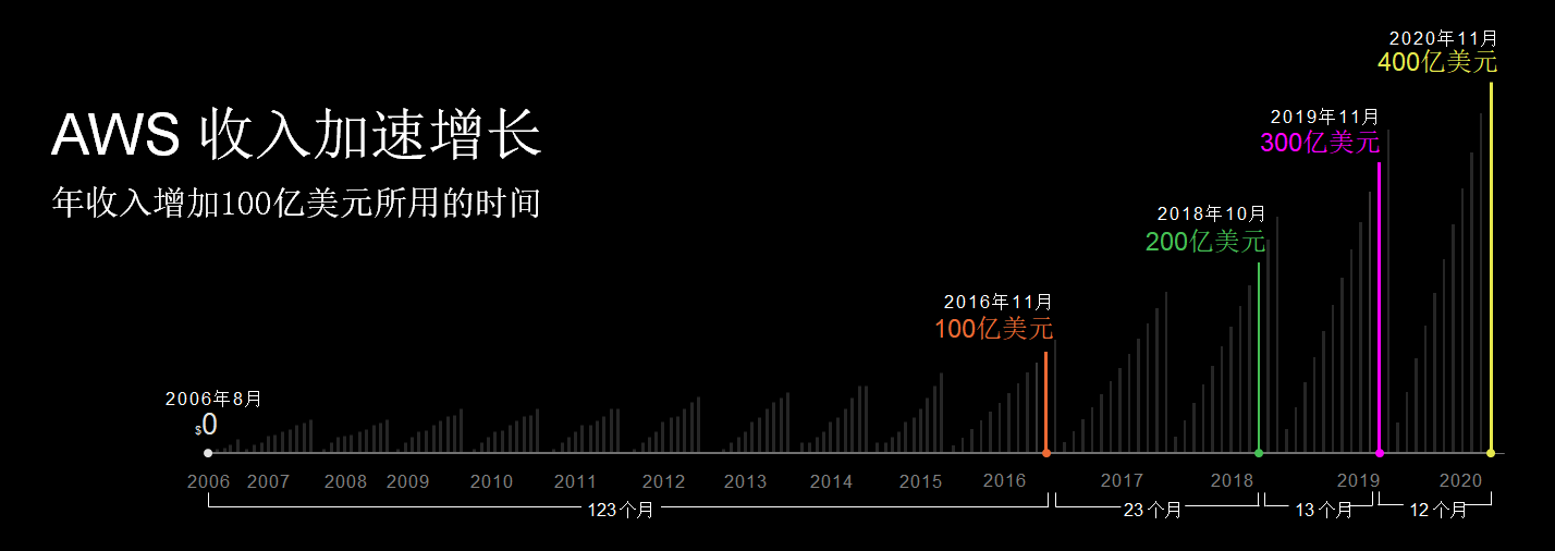 营收数字说明了一切。据 Andy Jassy 介绍,2020 年 Q3,亚马逊 AWS 收入同比增长 29%,相当于 2020 年一年增长了 100 亿美元。同时,AWS 每增长 100 亿美元所耗费的时间周期都在逐年缩短,AWS 第一个 100 亿美元耗时 123 个月,第二个 100 亿用时 23 个月...... 第四个 100 亿仅用了 12 个月。