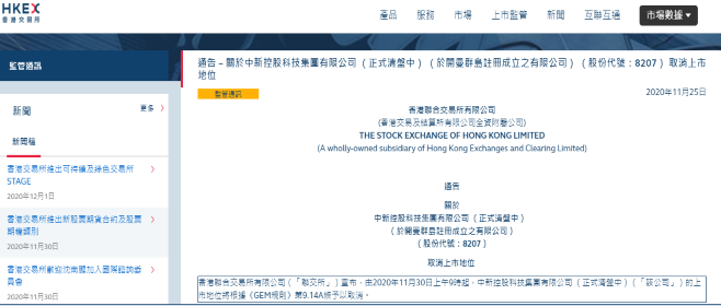 根据近期香港联合交易所和中新控股发布的公告,中新控股的最后上市日期为2020年11月27日,股份上市地位自2020年11月30日上午9时正起取消。