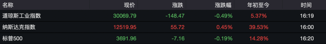 美东时间周一,美股三大指数涨跌互现。截至当日收盘,纳指报12519.95点,续创收盘历史新高,涨幅0.45%;道指报30069.79点,跌0.49%;标普500指数报3691点,微跌0.19%。