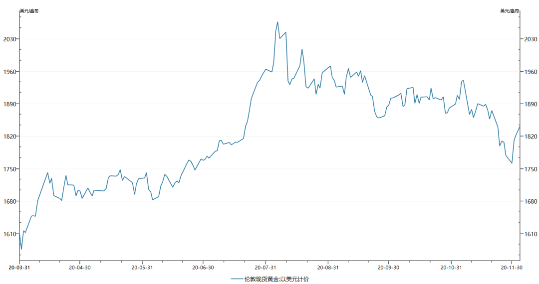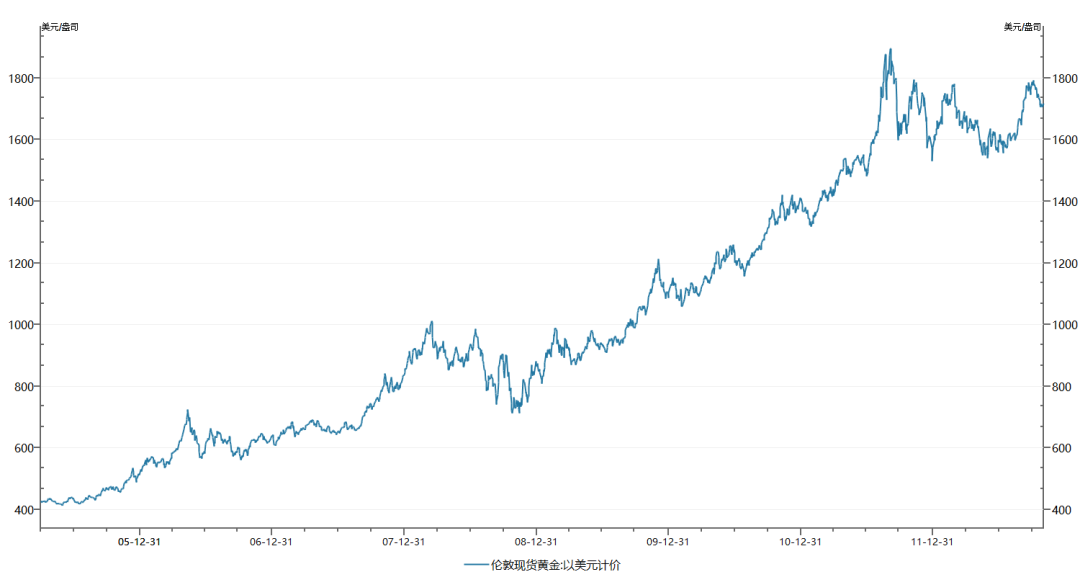 首先是黄金的价格,伦敦现货黄金按美元计价,从年初的1600美元/盎司,最高上涨至2000美元/盎司,上涨25%。